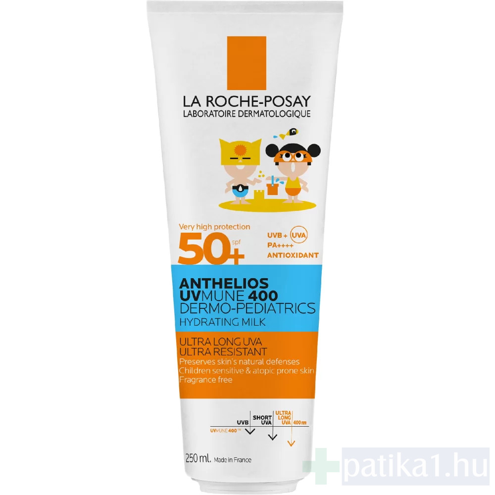 LA ROCHE POSAY Anthelios UVMune400 Dermo-Pediatrics Hidratáló napvédő tej SPF 50+ gyereknek. 75%-KAL KEVESEBB MŰANYAG FELHASZNÁLÁSÁVAL KÉSZÜLT A 250 ML-ES TUBUSAINKHOZ KÉPEST. A TUBUS RÉSZBEN KARTONPAPÍRBÓL KÉSZÜLT. DERMO-PEDIATRICS HIDRATÁLÓ NAPVÉDŐ TEJ SPF 50+ GYEREKEKNEK. Arcra és testre. Nagyon magas UVB/UVA-védelem + extra hosszú hullámú UVA-sugárzás elleni védelem. Segít megóvni a bőr természetes védekezőrendszerét. Nem hagy fehér nyomot. Illatanyagmentes. Bőrgyógyászati és gyermekorvosi felügyelet mellett tesztelt.Óvintézkedések: A túlzott napozás veszélyes. A csecsemőket és a kisgyermekeket ne tegye ki közvetlen napsugárzásnak. Ne tartózkodjon túlzottan hosszú ideig a napon még akkor sem, ha napvédő készítményt használ, mert egyetlen napozószer sem nyújt 100%-os védelmet. A készítményt közvetlenül napozás előtt vigye fel a bőrére. Napozás közben, különösen fürdés, izzadás vagy törölközés után, gyakran és bőségesen vigye fel újra a készítményt, hogy folyamatos védelmet biztosítson a bőrének. A gyermekeket mindig óvjuk a naptól sapkával, pólóval és napszemüveggel. Kerülje a szemkörnyéket! Ha szembe kerül, azonnal alaposan mossa ki! Kerülje a textilekkel való érintkezést. Gyermekek elől elzárva tartandó.3 éves kortól ajánlott.