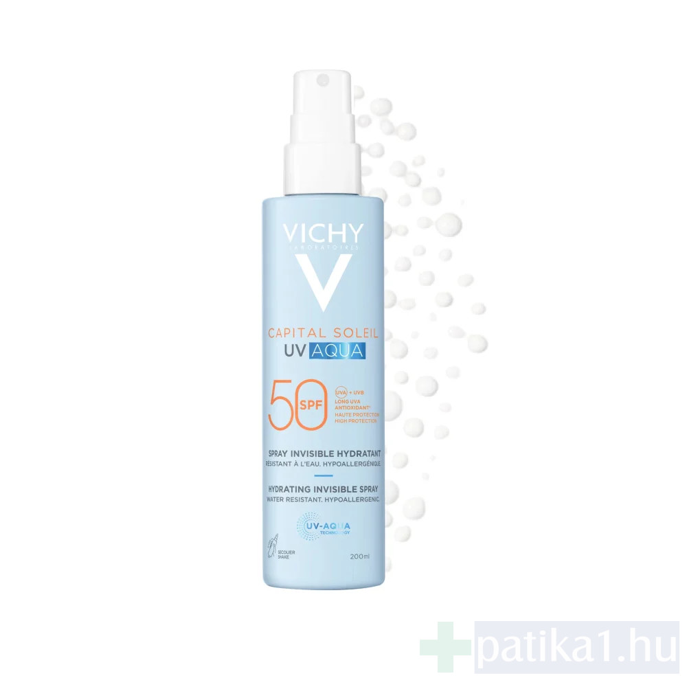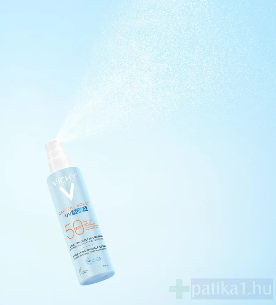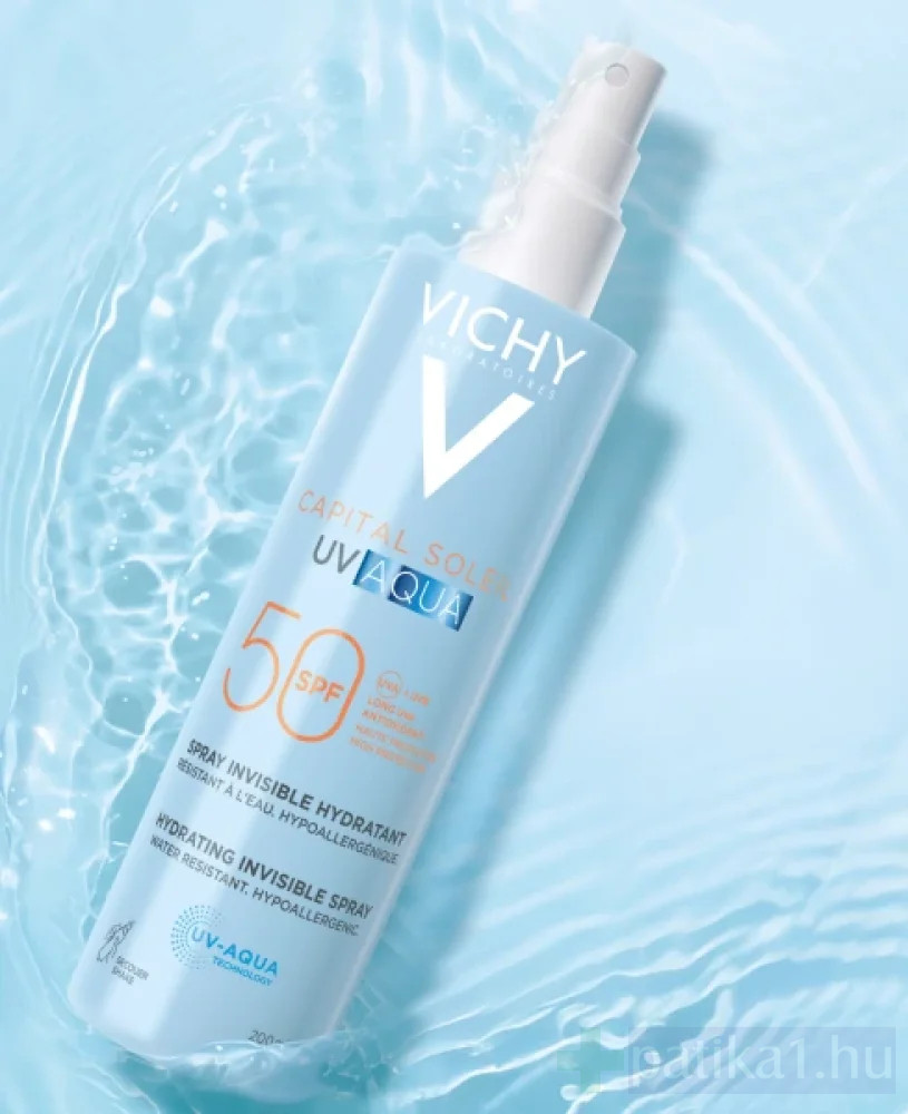 VICHY CAPITAL SOLEIL UV AQUA láthatatlan és hidratáló napvédő spray magas UVA+UVB védelemmel. Arc & Test. SPF50 MAGAS VÉDELEM. Fejlett UVB+UVA+HOSSZÚ UVA védelem. UV-Aqua technológia: hidratáló, friss és láthatatlan, akár a víz. Béta-karotinnal dúsítva, amely segít fokozni a barnulást. Bőrgyógyászati és szemészeti ellenőrzés mellett tesztelve. *Antioxidáns.