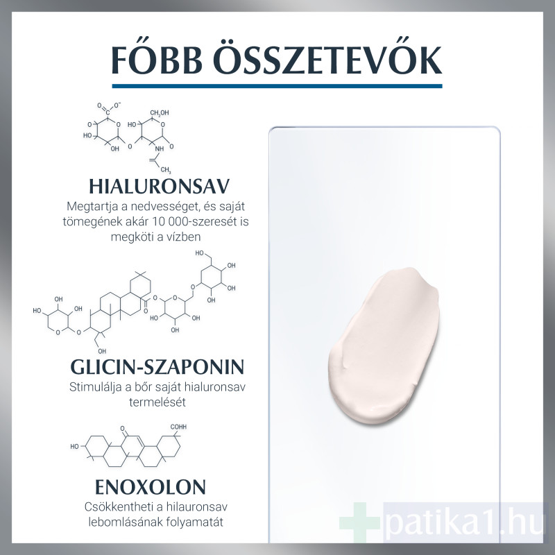 Az Eucerin egyedülálló formulája, melyben nagy és kis molekulatömegű hialuronsav egyaránt megtalálható, célzott hatásával belülről tölti fel még a legmélyebb ráncokat is. A nagy molekulatömegű hialuronsav a bőr külső rétegét hidratálja és teszi simává, míg a 40-szer kisebb (1) méretű, alacsony molekulatömegű hialuronsav behatol a bőr alsóbb rétegeibe is, a mélyebb ráncok eredetéhez.